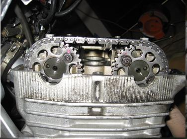 trochu pod úrovní kvůli tomu, že retěz není napnutý. Vačkami si můžeme